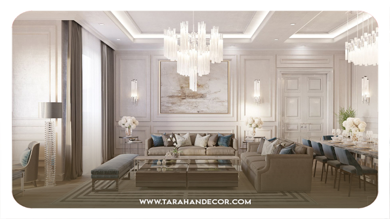 - برای طراحی داخلی منزل به سبک نئوکلاسیک، توصیه میشود به موارد زیر توجه کنید: